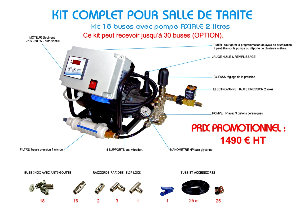 Lors des traites du soir le brumisateur chassera les mouches qui infestent et dérangent la traite des vaches laitières ou chèvres ou brebis. Ce kit de brumisation est étudié pour installer X buses sur tube polyamide dans la salle de traite une buse tous les 1m ou 0,75m en fonction du nombre de vaches. dans cette configuration nous avons pris une 2 x5 ou 2 x 7 et avec les buses restantes on peut brumiser une partie de l’aire d’attente, si vous le souhaitez on peut rajouter une extension du kit allant jusqu’à 30 buses pour brumiser une surface plus grande de l’aire d’attente. Ce kit peut aussi s’utiliser sur un robot de traite.